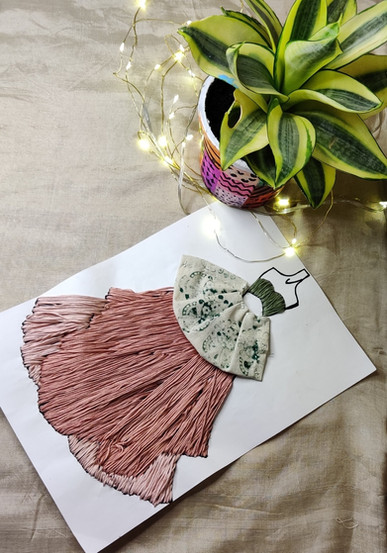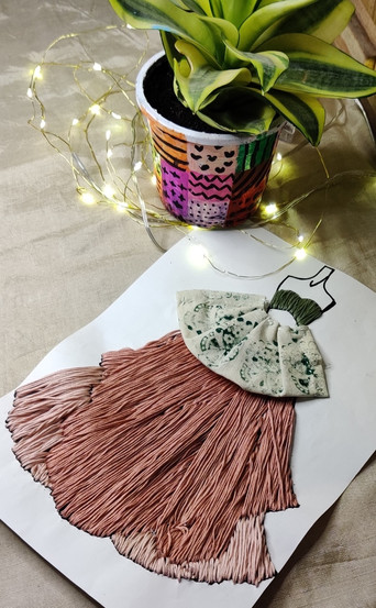 This beautiful Ghagra is a fusion of embroidery and knife pleating with balloon silhouette . I made the knife pleating using a fabric and stamped prints on it. Satin stitch embroidery has been used in this art piece. I visualize myself dressed up in this attire for an occasion!